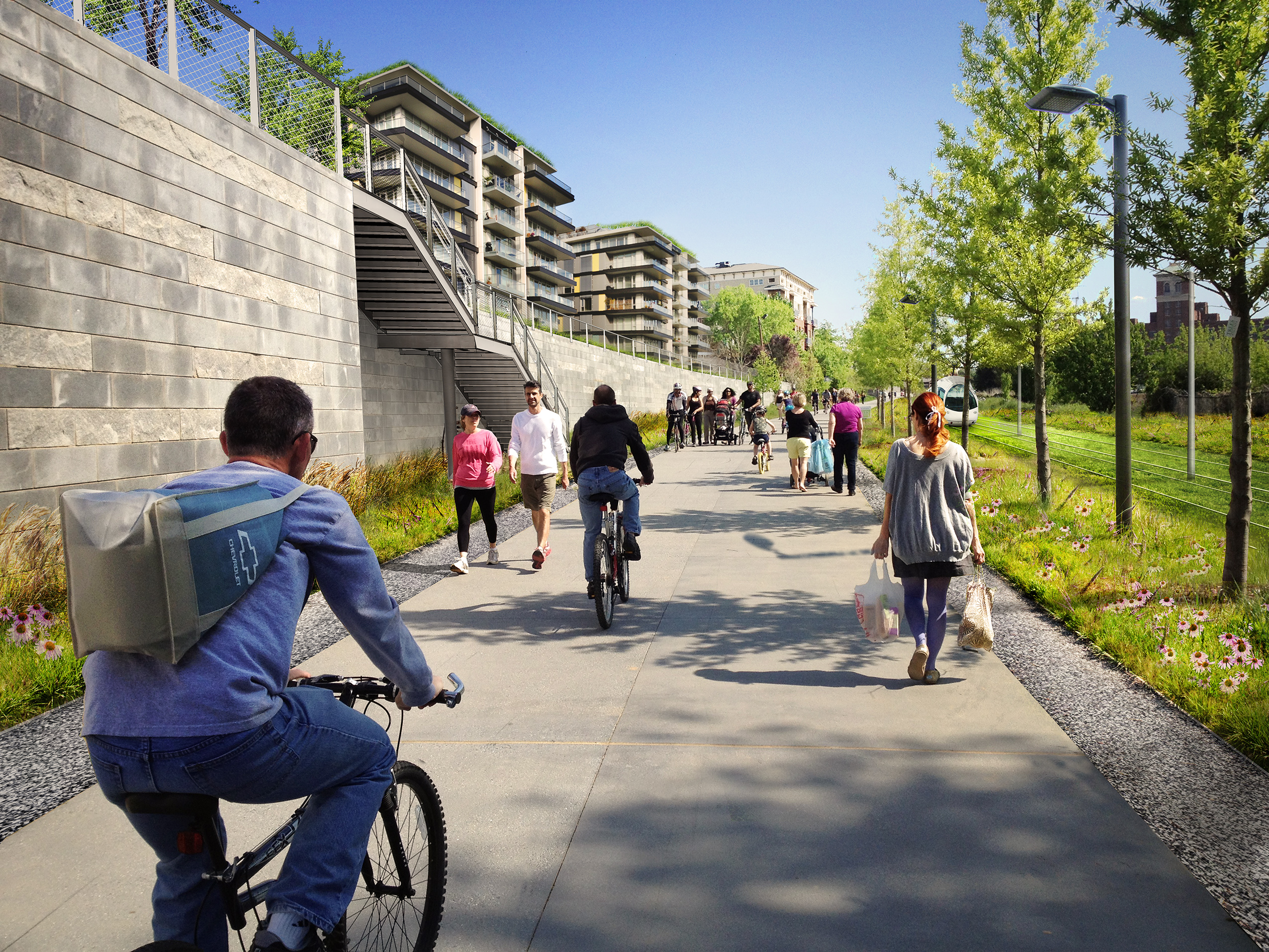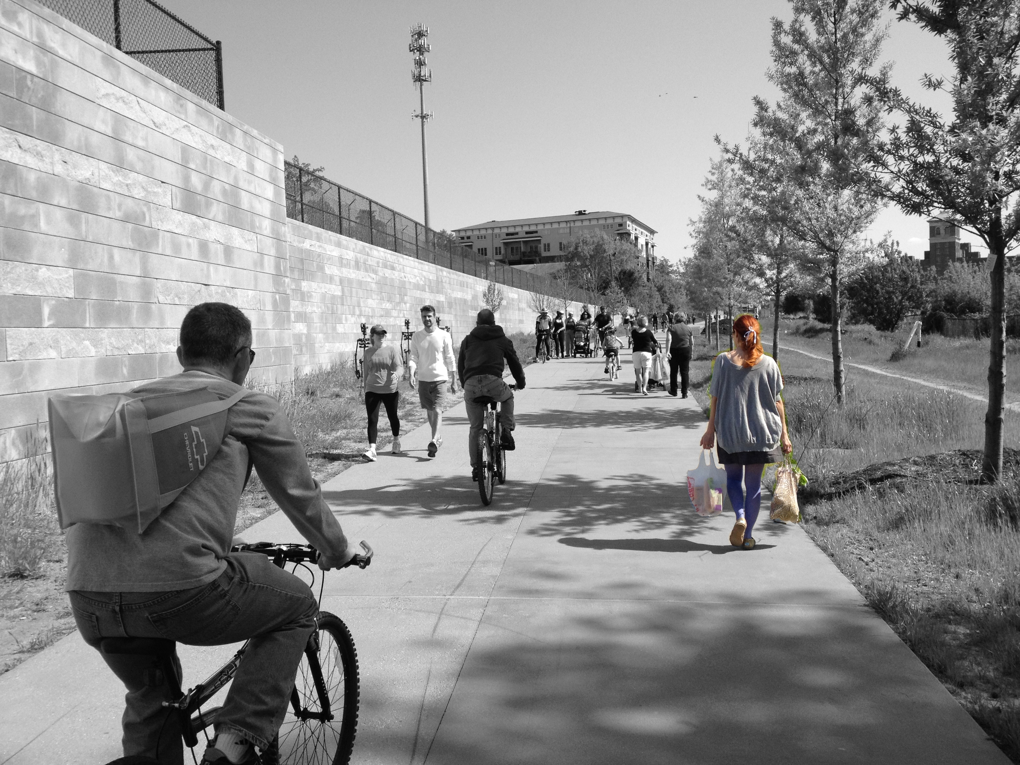 (ideas.) I took my kids out for a bike ride on a beautiful day last spring and the trail was mobbed. I was taking pictures with my phone, including this one, (second image), but it wasn’t until I got home that I noticed the woman with red hair on the right. She’s carrying her groceries. And in the process, she’s validating everything we always said the Atlanta Beltline would do. It’s not only changing the physical form of the city, it’s changing our way of life. Thanks to Luke at Perkins+Will for illustrating the finished trail, transit and new development, (final image; all images credit Perkins+Will). >> Ryan Gravel
