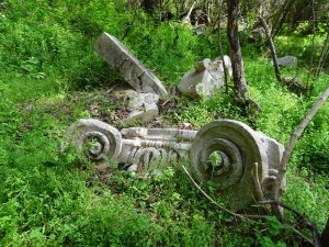 A few remnants of the farm remain. Our journey took us down a terraced landscape that feels like an overgrown orchard. Two old farm ponds reflected the sky through their protected openings in the now-dense forest canopy. Nearby stood crumbling ruins of old barracks and other buildings.