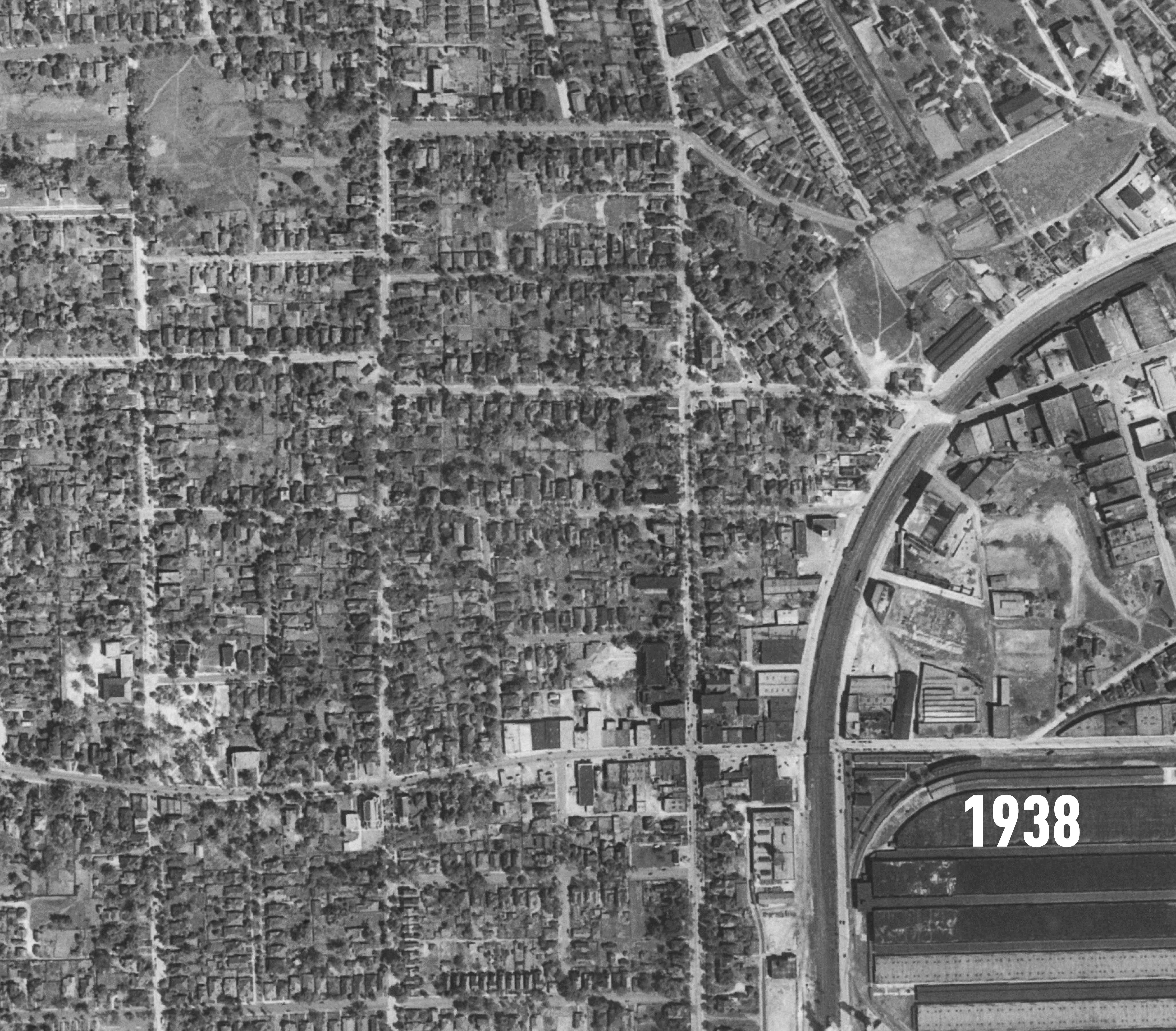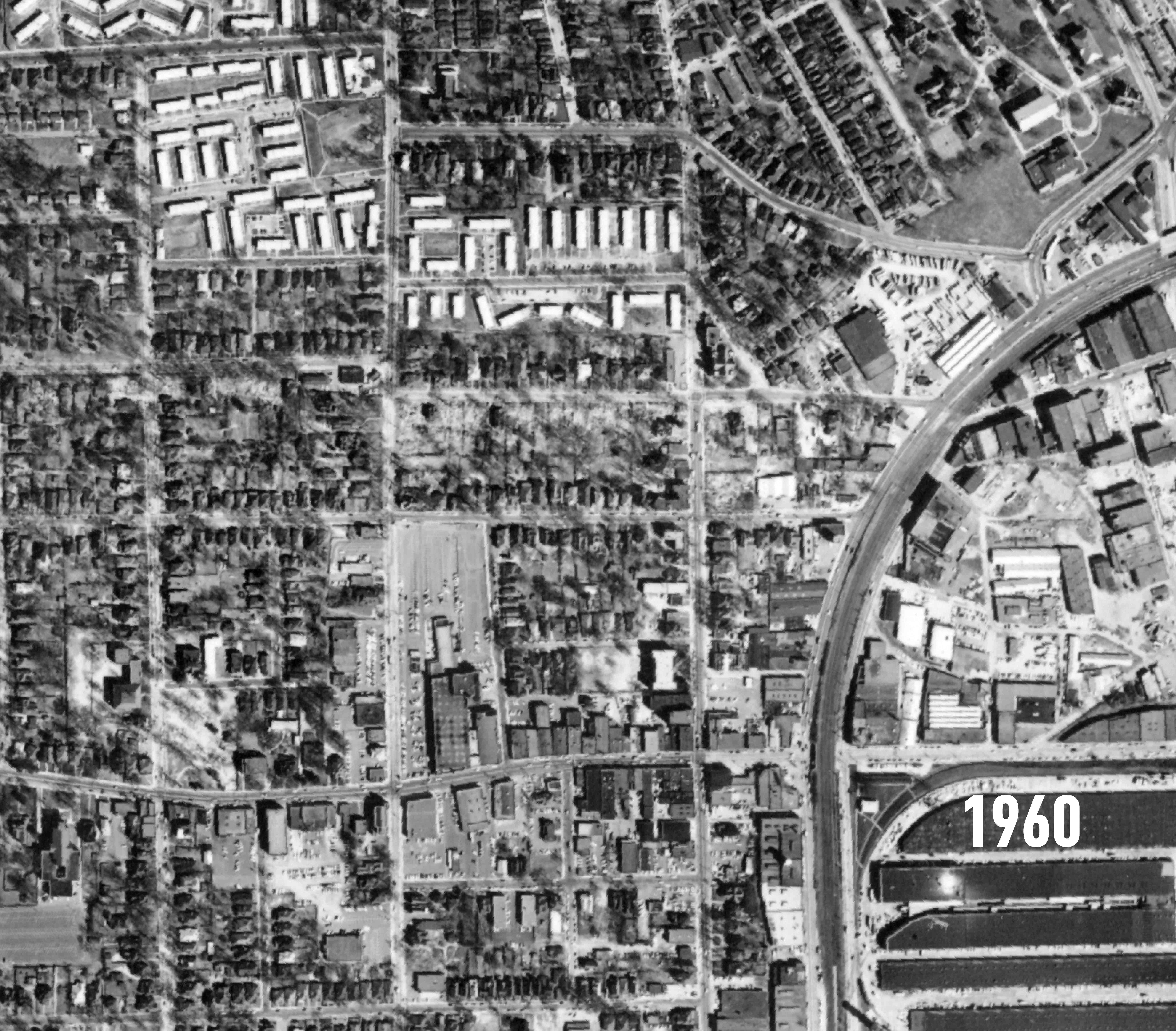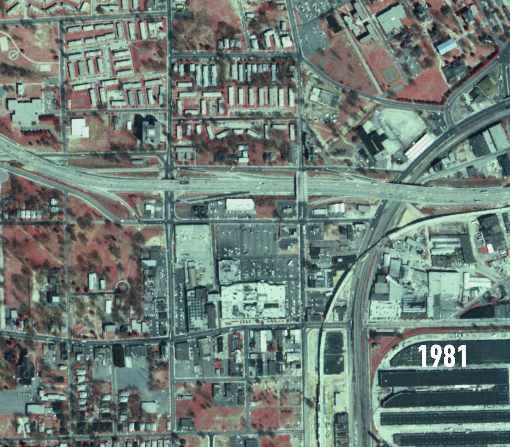 A similar thing happened with the alignment of I-20 immediately southwest of downtown. It was designed to create a barrier between the African American neighborhoods surrounding the Atlanta University Center, a prominent collection of HBCUs, (the AUC currently includes Spelman College, Morehouse College, Morehouse School of Medicine, and Clark Atlanta University), and West End, a historically upper-crust white neighborhood to the south. These aerial images tell the brutal story. In 1960, a huge swath west of the AUC was cleared for public housing. Then the highway came through in the mid-60s. By the 1980s, most of eastern West End had also been cleared for commercial development. Rather than providing support for communities to rebuild their own lives, this destruction was the intentional outcome of government policy. And the legacy of that loss lives on today.